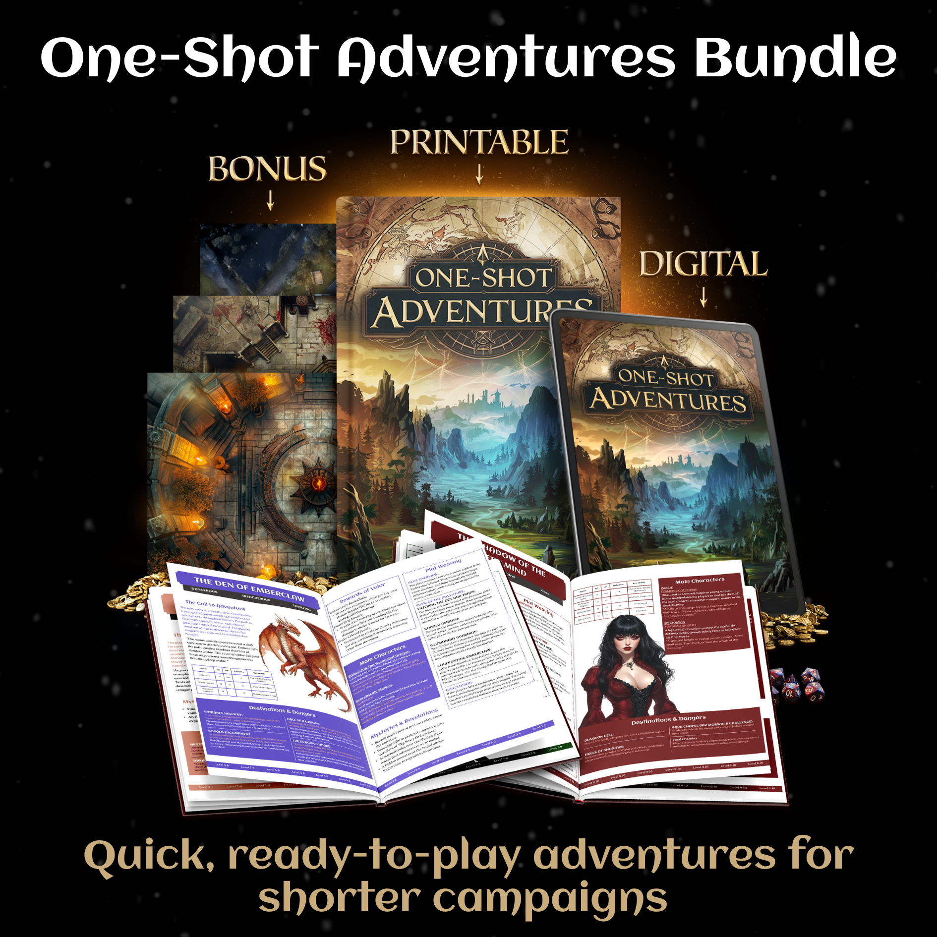 Enjoy 100 ready-to-play one-shot stories, each designed to fit on just two pages, covering a variety of levels and settings. Plus, every story comes with a FREE map included, making it easy to jump into your next session without prep!